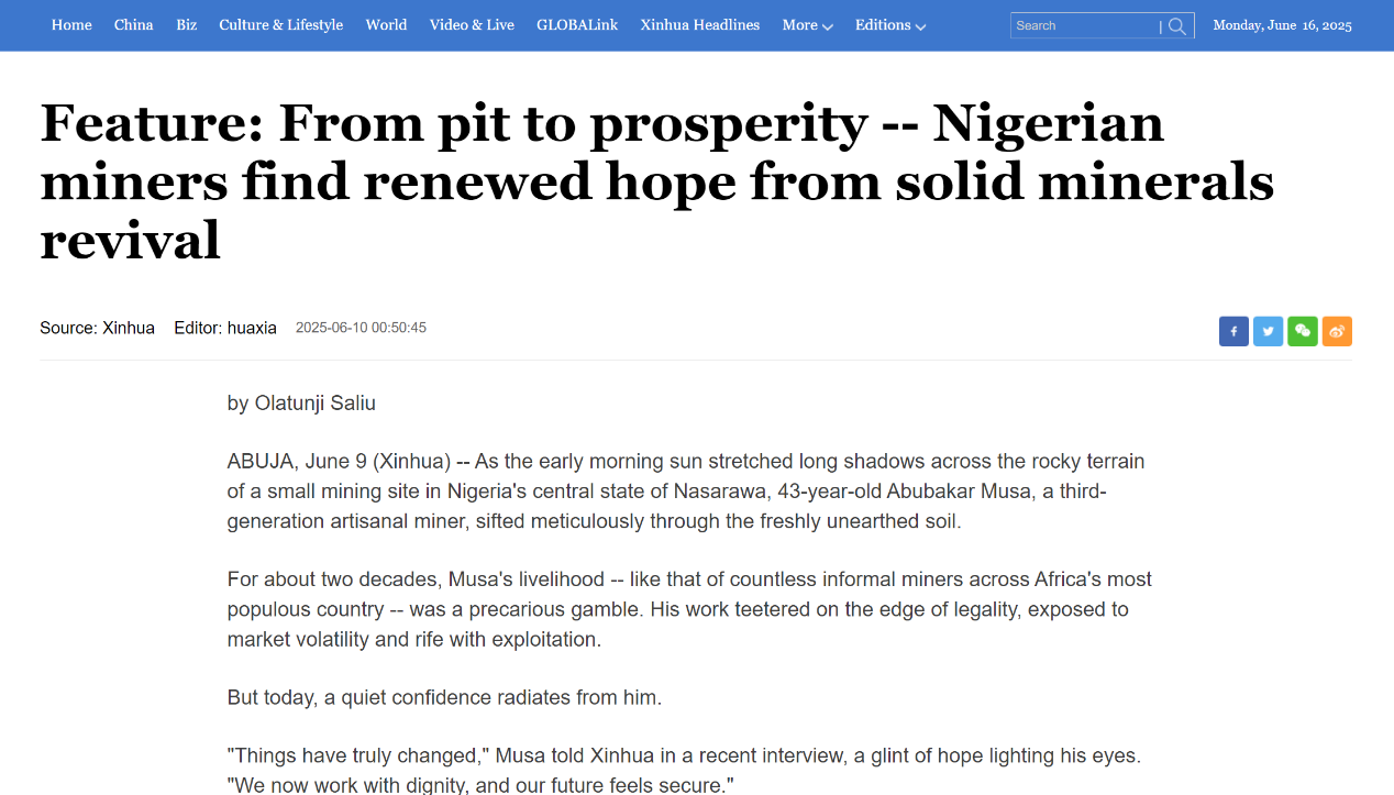 近日,新華社(Xinhua)發(fā)布題為《從礦坑到繁榮:尼日利亞礦工在固體礦產(chǎn)復(fù)興中重燃希望》(From pit to prosperity -- Nigerian miners find renewed hope from solid minerals revival)一文,生動(dòng)講述了尼日利亞在總統(tǒng)博拉?提努布政府推動(dòng)下,固體礦產(chǎn)產(chǎn)業(yè)迎來轉(zhuǎn)型,帶動(dòng)礦工生活改善與國家經(jīng)濟(jì)多元化的故事。文章分別采訪了第三代手工礦工阿布巴卡爾?穆薩,從他的視角展現(xiàn)了礦工從非法作業(yè)、生計(jì)無著到加入正規(guī)合作社、獲得尊嚴(yán)與保障的轉(zhuǎn)變;同時(shí)采訪了固體礦產(chǎn)開發(fā)部長(zhǎng)德勒?阿拉克,從政策層面介紹了政府通過“重燃希望議程”、七點(diǎn)路線圖推動(dòng)產(chǎn)業(yè)本地化加工,以及 2024 年吸引超 8 億美元加工投資、政府收入從 60 億尼日利亞奈拉(約 385 萬美元)躍升至 380 億奈拉(約 2440 萬美元)的成果;此外還采訪了北方國際分公司副總經(jīng)理魏國亭,從企業(yè)實(shí)踐角度介紹了中國公司通過 3D 地質(zhì)建模、智能勘探技術(shù)及本地化培訓(xùn)計(jì)劃(已培養(yǎng)超 1000 名尼日利亞技術(shù)人才),助力尼日利亞鋰礦等礦產(chǎn)資源的價(jià)值提升與產(chǎn)業(yè)升級(jí)。全文如下: